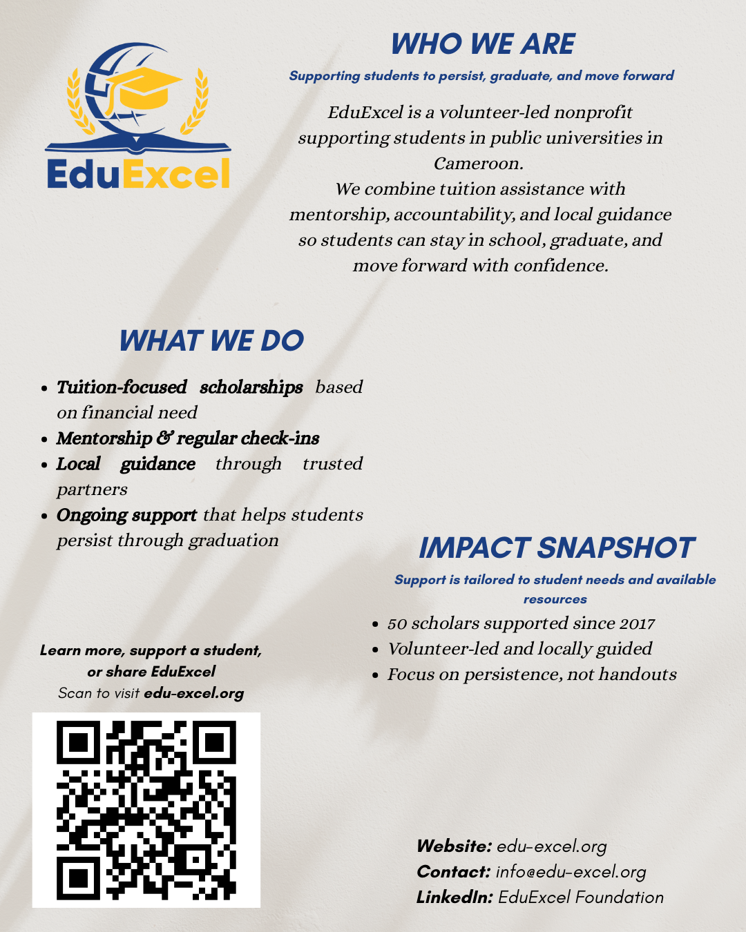 Not everyone can mentor or donate, but everyone can help. Sharing EduExcel with your network helps students discover support and helps partners find us.